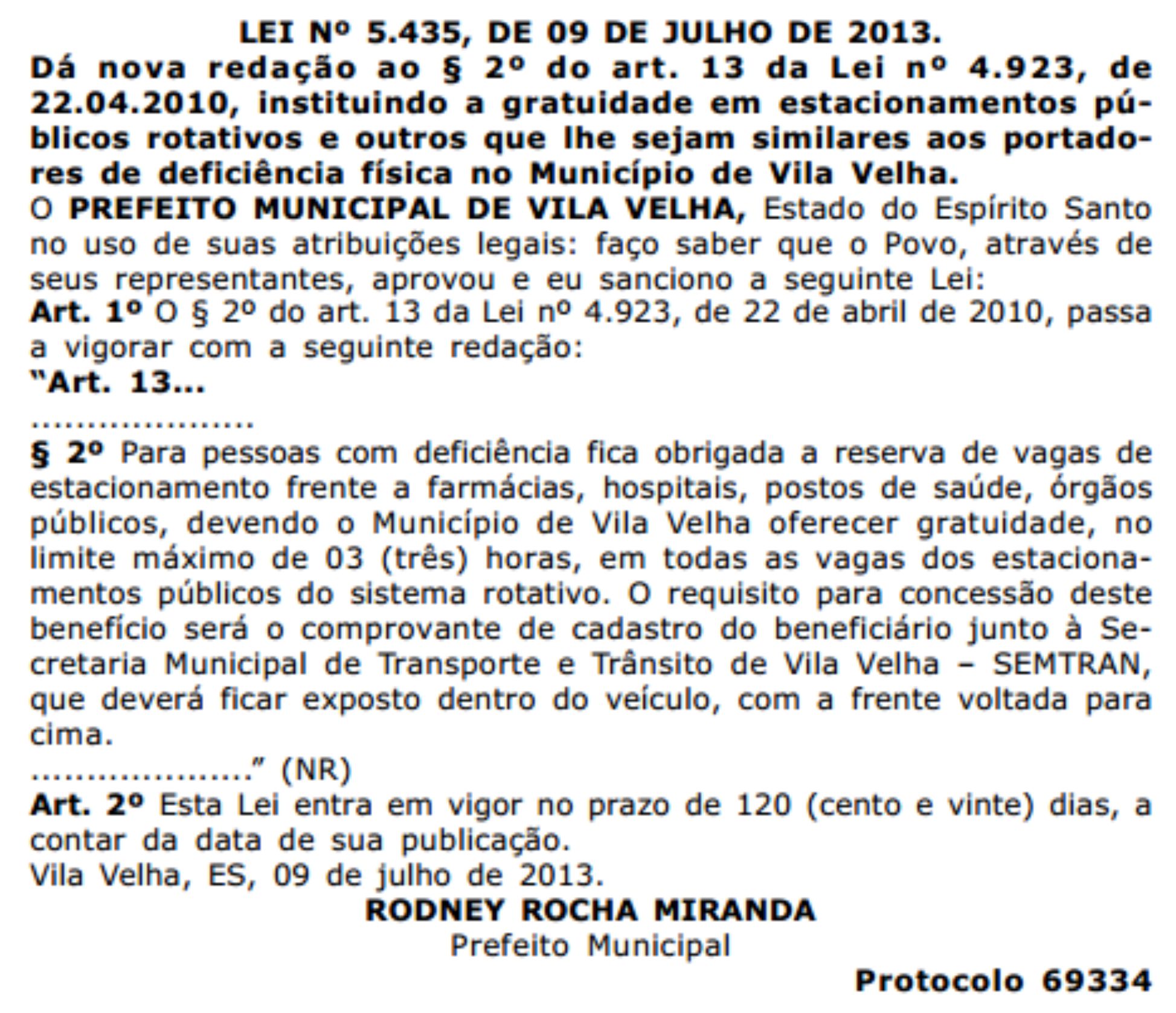 Nesse sentido, o projeto de lei em comento trata-se de uma ação afirmativa do município de Vila Velha em garantir o direito de acessibilidade aos cidadãos beneficiados por esta lei, alterando a Lei 4.923/2010, no que concerne a concessão de gratuidade nos espaços reservado ao estacionamento rotativo regulamentado às pessoas com deficiência.
