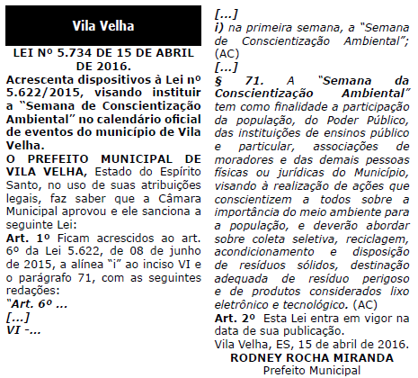 LEI Nº. 5.734/2016 - Em Vigor
